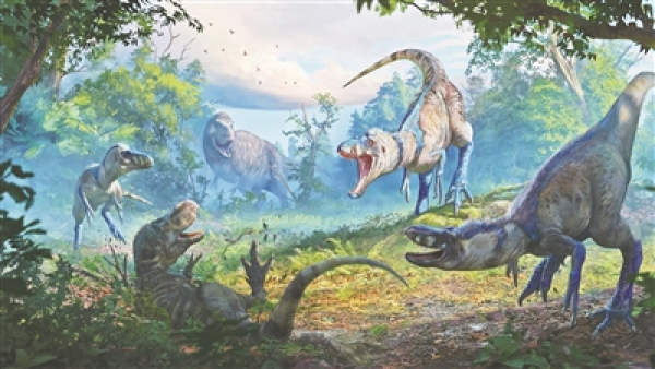 艺术复原图展示了一群矮暴龙袭击真正的幼年霸王龙。图片来源:《自然》网站