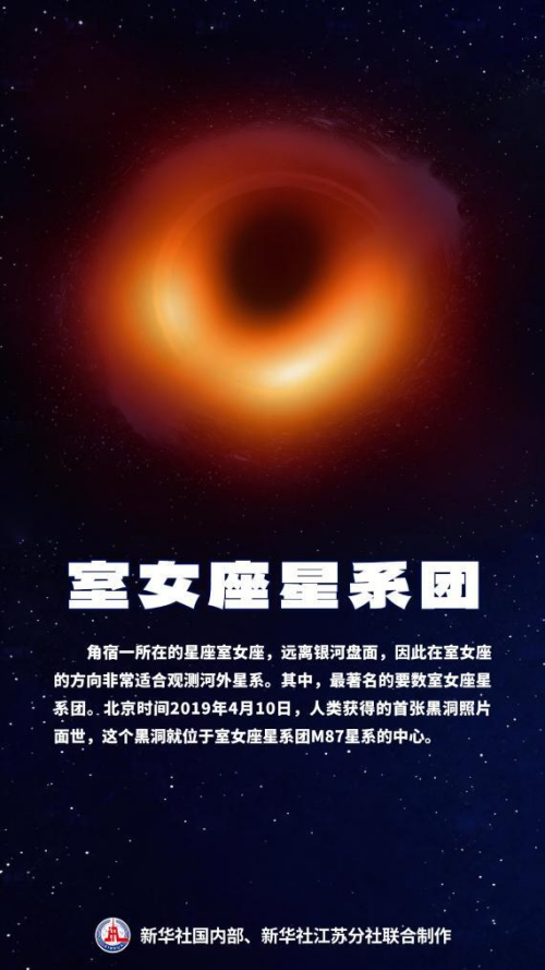角宿一所在的星座室女座,在全天88个星座中面积排行第二位,春季天黑后会出现在东方天空。由于室女座远离银河盘面,因此在室女座的方向非常适合观测河外星系。在位于室女座天区的众多河外星系中,最著名的要数室女座星系团。这是一个由超过2000个星系组成的不规则星系团,其中心距离我们约6000万光年。北京时间2019年4月10日,人类获得的首张黑洞照片面世,这个黑洞就位于室女座星系团中的M87星系的中心。