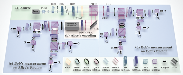 在实验实现方面,团队采用路径和偏振自由度混合编码构建八维子空间,提高了高维移位操作和构建高维测量的效率,展示出优越的可扩展性。基于共享的八维纠缠,通过全出口高维测量,实现对发送方编码信息的随机解码。实验测得成功率S=0.9729±0.0001,超过七维纠缠所达到的理论成功率上界0.9677,认证了所共享的纠缠态维度不低于八维。