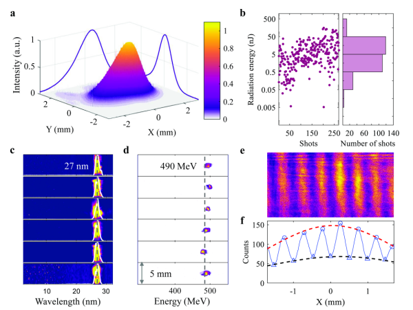 研究团队通过显著提升激光尾波场加速的电子束品质,并结合创新设计的紧凑型束流传输与辐射系统,在实验上首次实现了基于激光加速器的自由电子激光放大输出,典型激光波长27纳米,最短激光波长可达10纳米级,单脉冲能量可达100纳焦级,在国际上率先完成了台式化自由电子激光原理的实验验证,对于发展小型化、低成本自由电子激光器具有重要意义。相关研究成果于7月22日作为封面文章发表于《自然》(Nature)杂志。