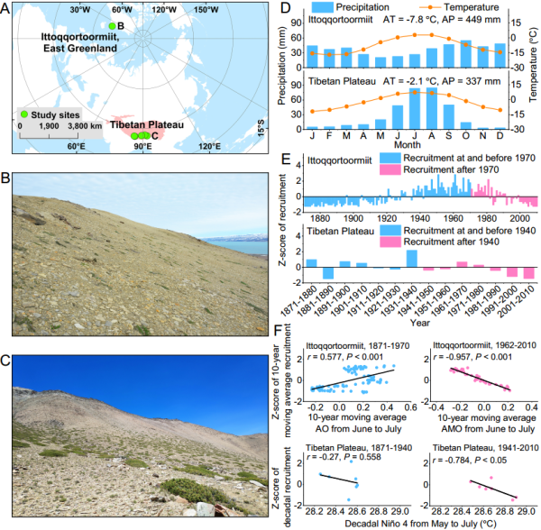 格陵兰Ittoqqortoormiit与青藏高原研究样点(A-C)、区域气候(D)、灌木更新(E)、大气环流与灌木更新线性关系图(F)