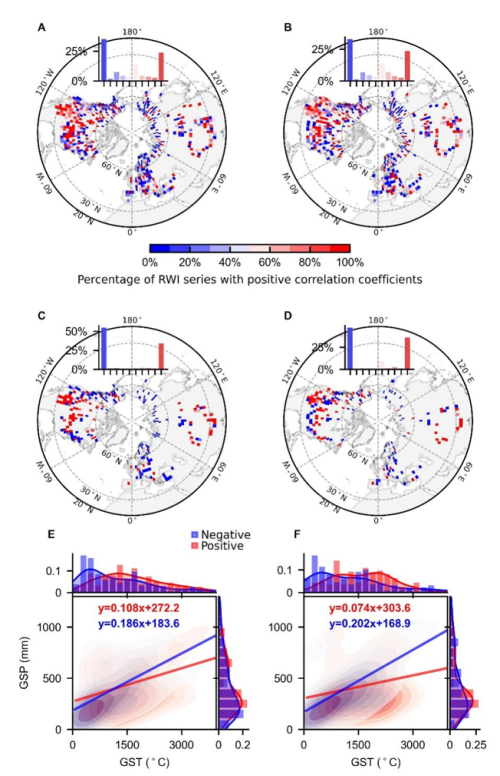 图1.生长季提前对树木径向生长影响的空间格局(GSP:30年平均生长季降水,GST:30年平均生长季积温)