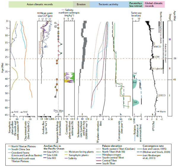 图3 亚洲气候记录、高原隆升记录及与全球气候变化等的对比