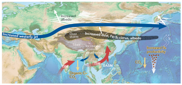 研究人员表示,季风演化还对全球气候变产生了重要影响,季风在2600万年前加强,导致喜马拉雅地区侵蚀和硅酸盐风化加剧,并影响湿润地区的风化和有机碳埋藏;中亚干旱化增加的粉尘排放,也会通过增强反照率、卷云形成和海洋生产力等形式对全球气候产生巨大影响(图4)。